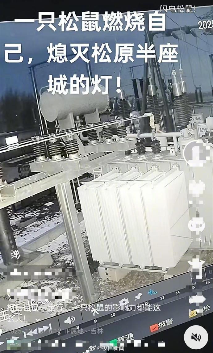 12月6日,吉林省松原市江南部分区域发生停电事故。有网友发布一则监控视频称,是一只松鼠跑上了变压设备,导致“半城”停电。